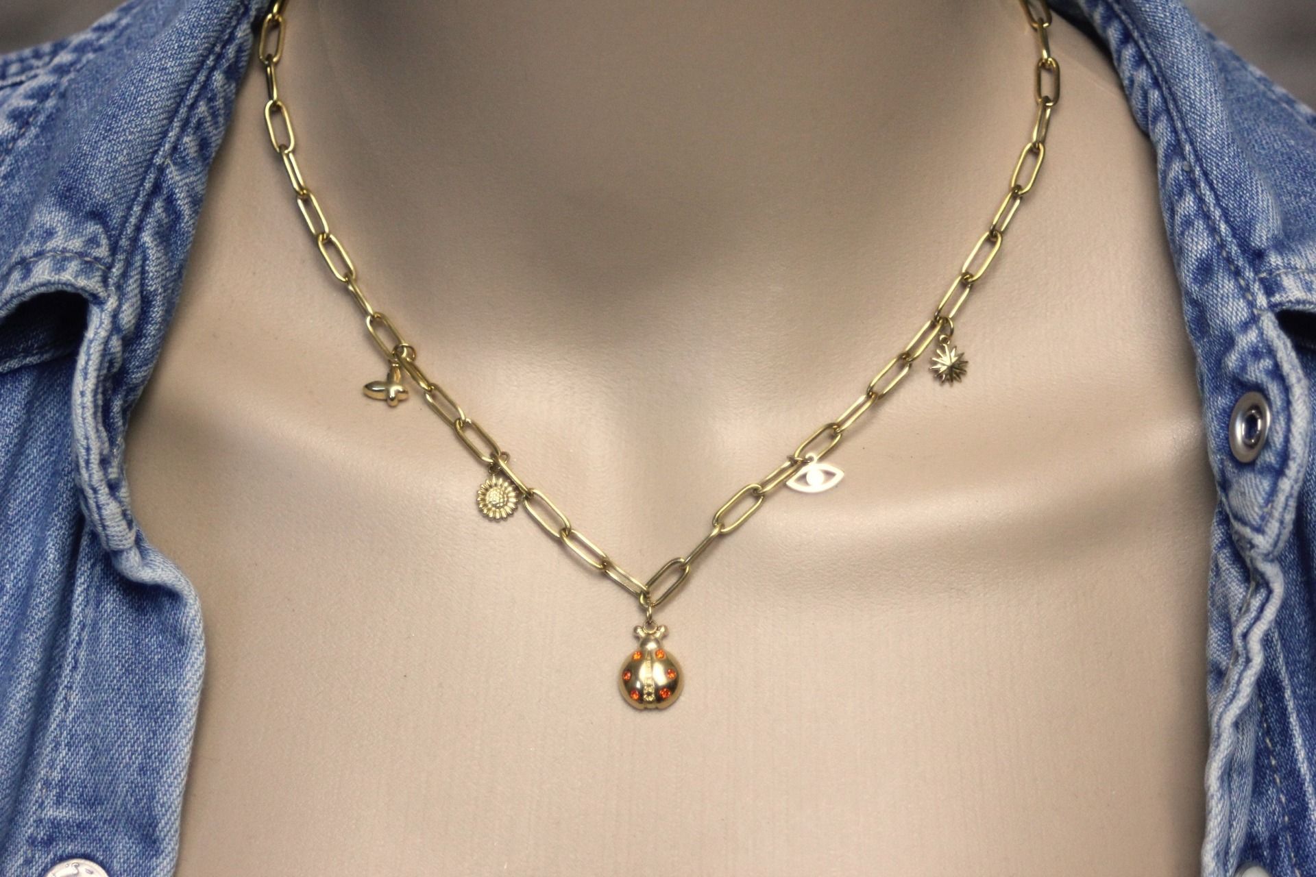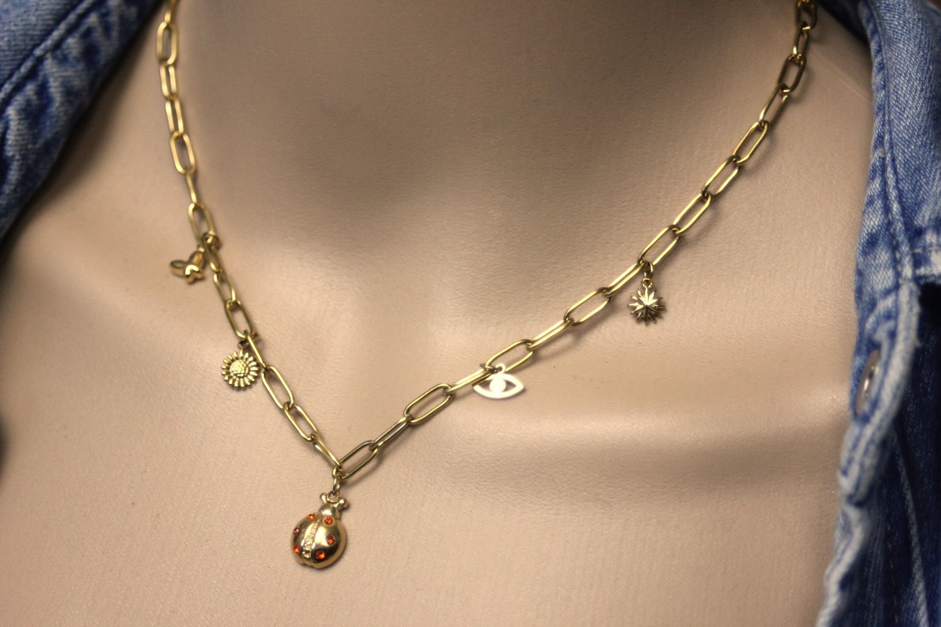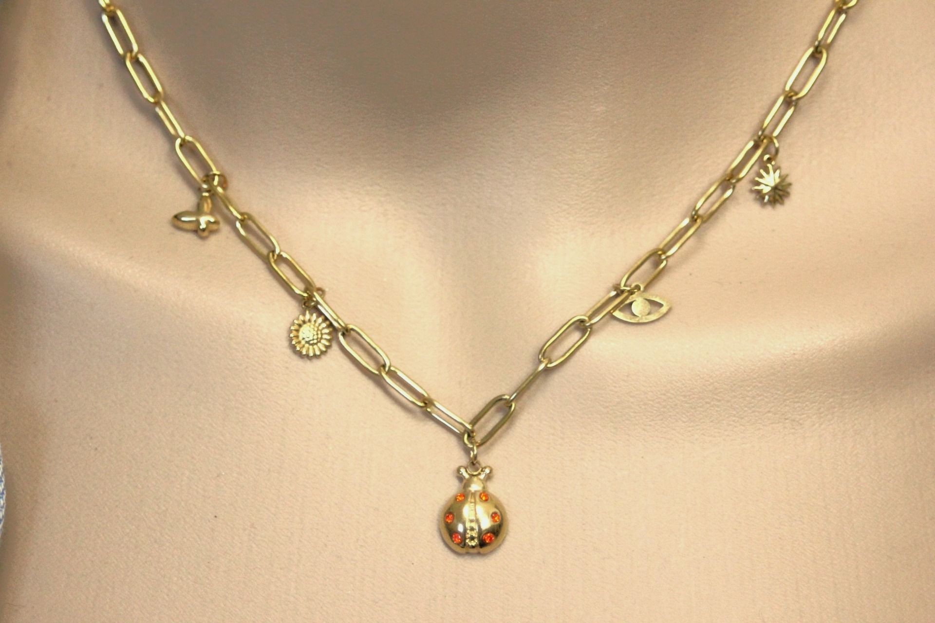Collier en acier inoxydable doré t breloques coccinelle, papillon, fleur de tournesol, soleil et oeil.