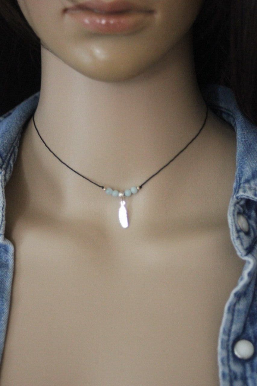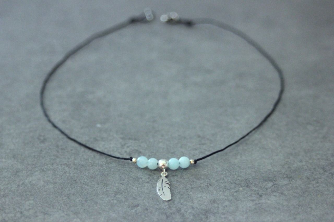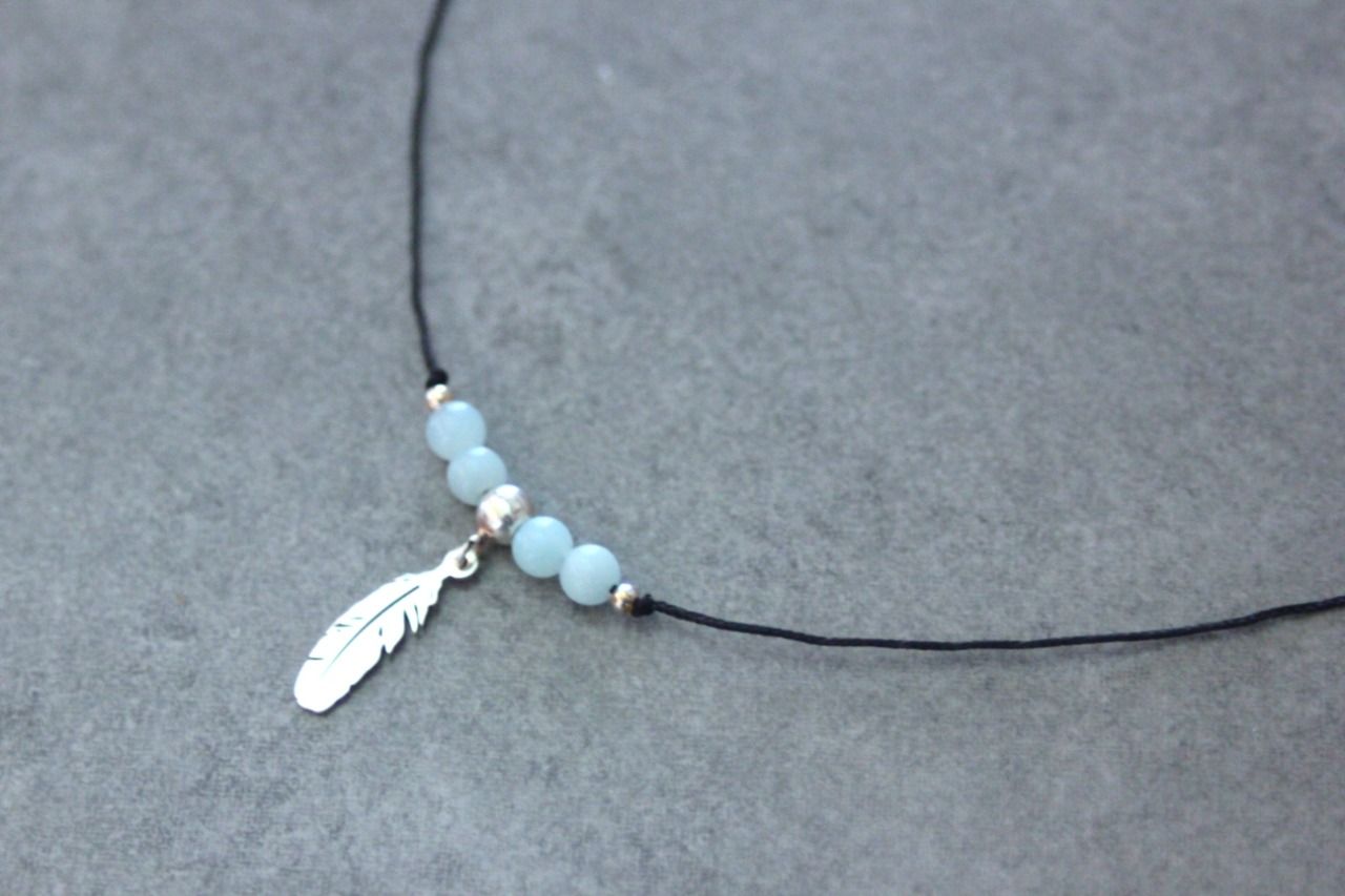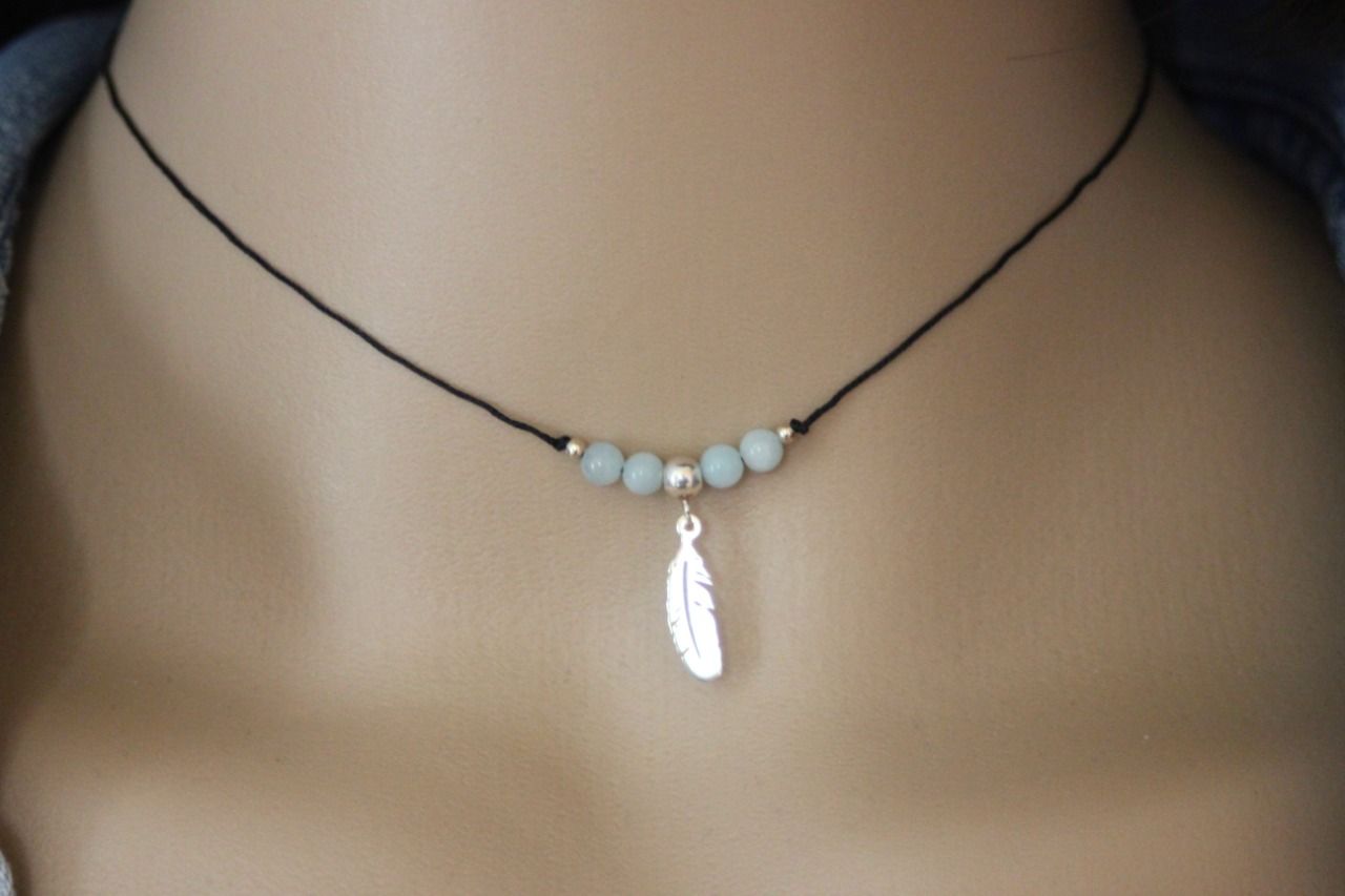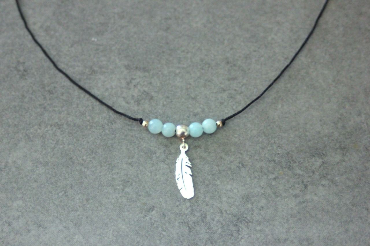 Collier cordon noir perles pierre naturelle amazonite et argent massif pendentif plume. Longueur réglable