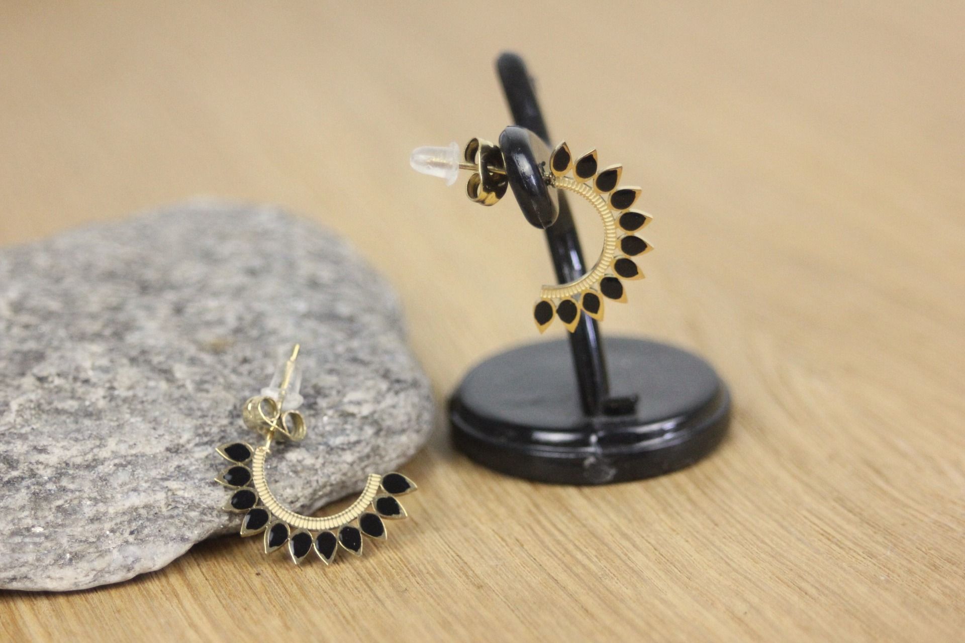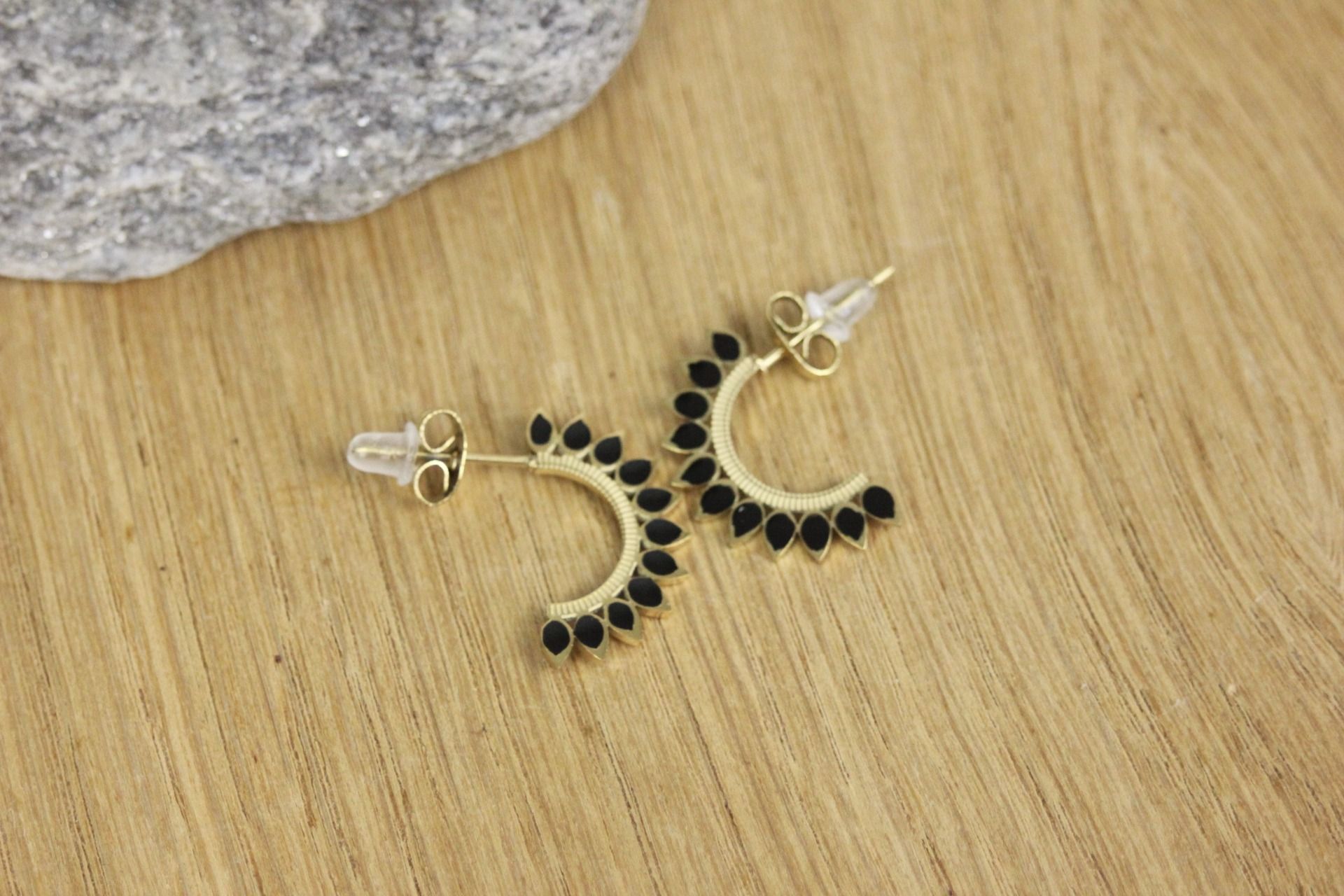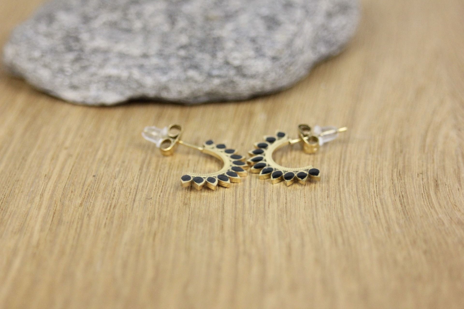 Boucles d'oreilles ethniques demi créoles en acier inoxydable doré et résine noire