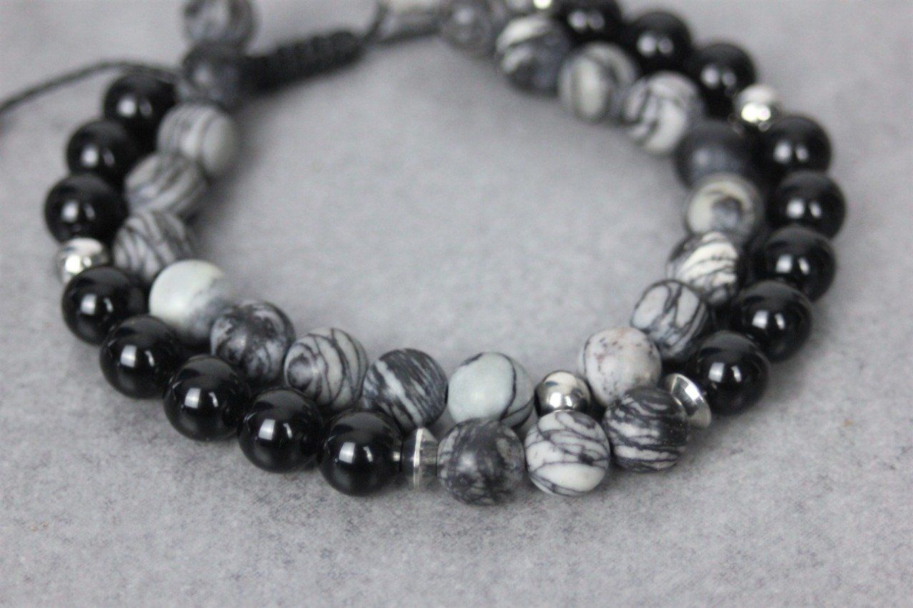 Ensemble de 2 bracelets en perles onyx noir, jaspe picasso et acier inoxydable - bracelet pierres naturelles - bracelet pierres gemmes - Bracelet perles grises