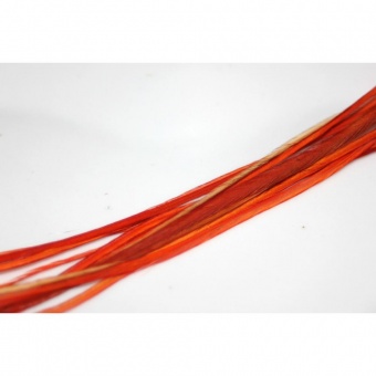 Plume naturelle de couleur Rouge orangé. Longueur entre 20 et 23cm. A fixer avec un anneau silicone. N'oubliez pas de préciser le numéro de la couleur de l'anneau désiré au moment de la validation de la commande.