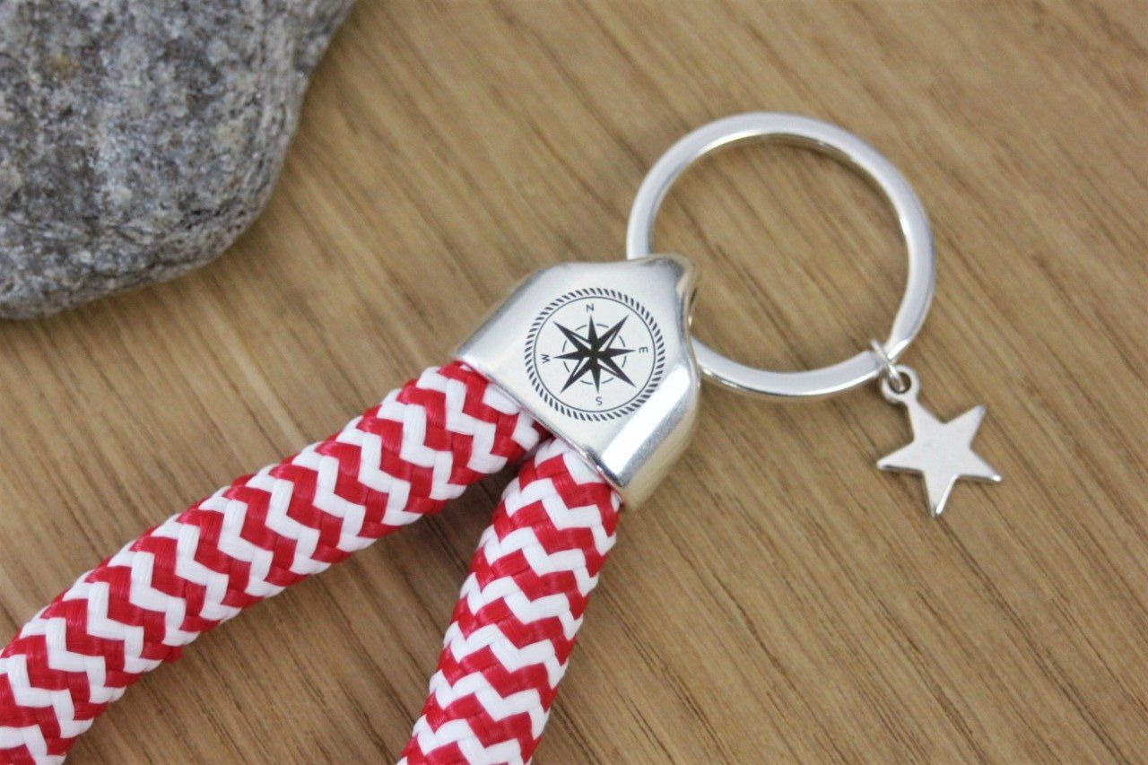 Porte clé sur le thème de la mer, réalisé avec une corde à voile de 10mm de diamètre et métal DQ de très haute qualité plaqué véritable argent.
