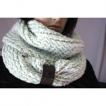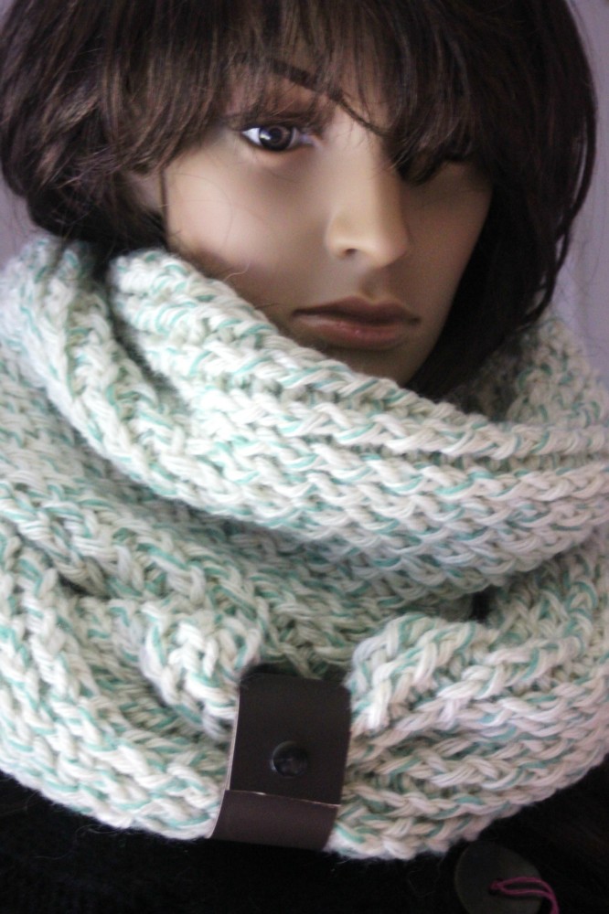 Snood / Echarpe tube / Col tricoté laine couleur blanc cassé et vert pastel et lacet en cuir marron