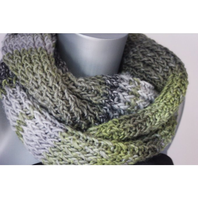 Snood 2 tours, écharpe oversize tricotée à la main avec une laine dégradée de couleur vert kaki, gris anthracite et gris clair.