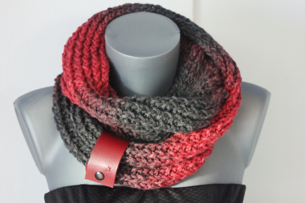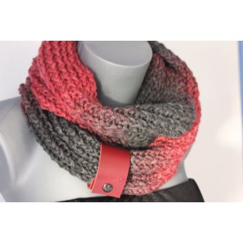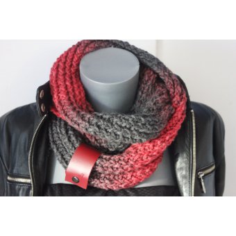Snood 2 tours, écharpe oversize tricotée à la main avec une laine dégradée de 2 couleurs : rouge et gris acier. Original avec son lacet en cuir rouge.